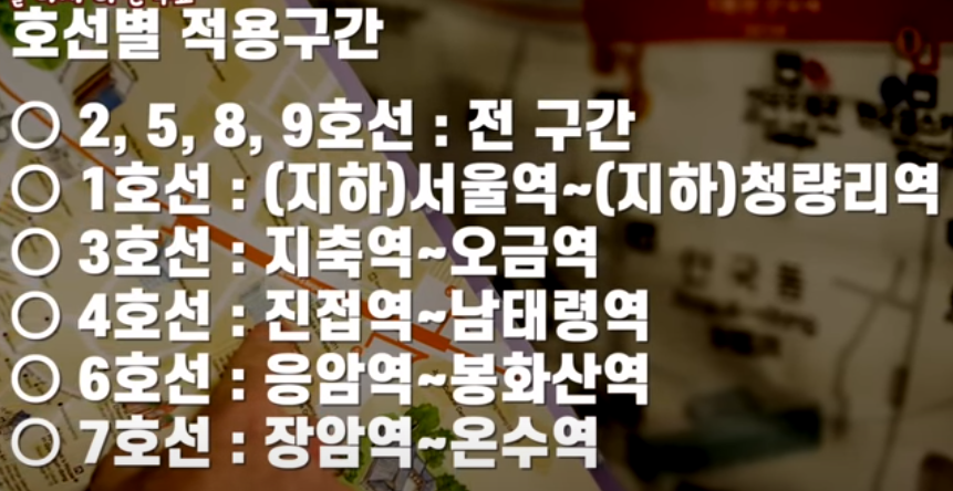 2, 5, 8, 9호선은 전 구간이 해당하고 1, 3, 4, 6, 7호선은 다음 구간에만 적용된다는 점 미리 확인하시면 좋겠습니다.