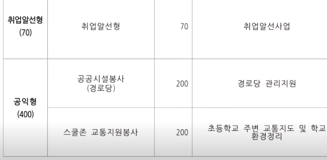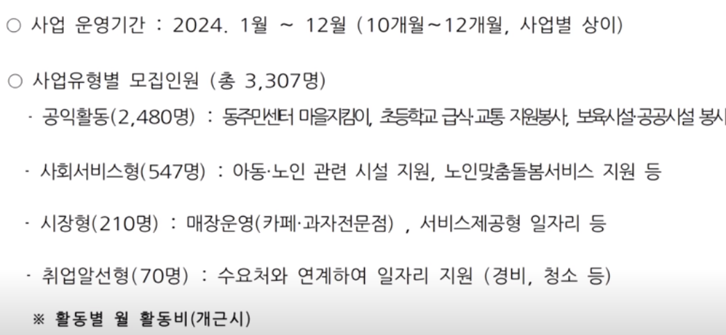사회서비스형은 노인맞춤 돌봄 서비스, 초등학교 아이돌봄서비스, 교육 시설 학습 보조, 공공기관 행정 지원 등의 일을 하고요 월 60시간 근무에 주휴수당까지 더해서 76만 천 원을 받습니다. 이 외에 민간형은 스타벅스 DT 쩜 보행자 통행 안내, 카페 같은 소규모 매장에서 거의 알바처럼 일을 하는 건데요 각 지자체나 협력 업체에서 노인 일자리를 만들면 정부에서 인건비를 일부 지원합니다.