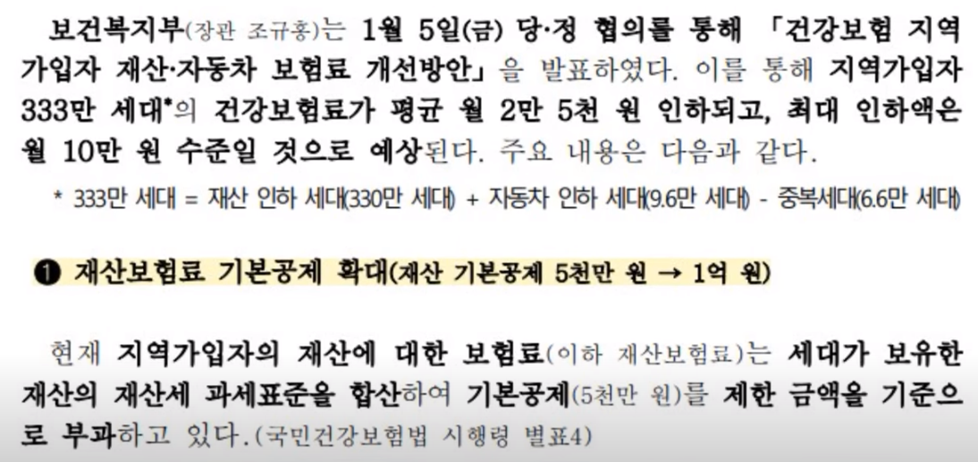 보건복지부는 재산보험료 기본공제를 기존 5천만 원에서 1억 원까지 확대하면서 지역가입자 330만 세대에 월평균 보험료가 인하될 것으로 전망되고, 월평균 재산 보험료 9만 2천 원에서 6만 8천 원으로 약 2만 4천 원가량 인하될 것으로 예상됩니다.