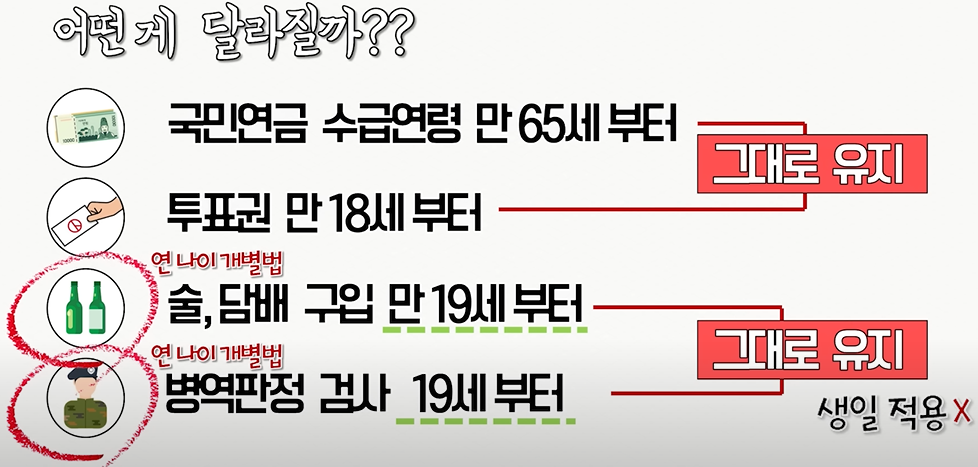 그리고 국민연금이나 기초연금을 수령하는 분들, 투표권 같은 경우는 현재 만나이를 적용하고 있어서 크게 바뀌는 건 없지만 그동안 임금피크제나 보험의 특약 같은 경우 만 나이를 쓸 거냐? 한국식 나이를 쓸 거냐? 를 두고 말들이 많았는데 이제 명확한 기준이 생기는 만큼 혼란이 줄어들 수 있고요 반대로 술과 담배를 구입할 수 있는 나이와 병역판정 검사 등 현재 연나이를 사용하고 있는 개별법들도 원래는 생일을 적용한 만 나이를 적용해야 하는데 한 번에 바꿔버리면 일상생활에서의 혼란이 생길 수 있어 일부 개별법들은 그대로 유지하되 앞으로 사회적 논의를 거쳐 결정하겠다고 하였습니다.