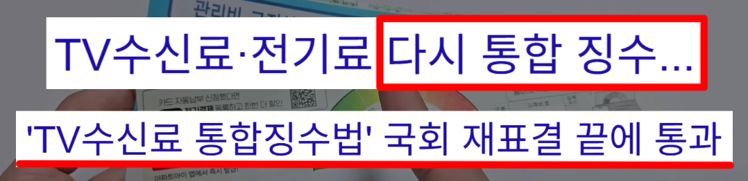 근데 이제 다시 예전으로 되돌아갑니다. 이 전기료에 매달 꼬박꼬박 2,500원씩 다시 부과됩니다. 왜냐하면 다시 통합해서 징수하는 방송법 개정안이 국회의 재표결 끝에 통과되었기 때문입니다. 그래서 이제부터 아파트든 주택이든 전 국민 누구나 이렇게 TV 수신료가 고지 서해 포함되어 나옵니다.
